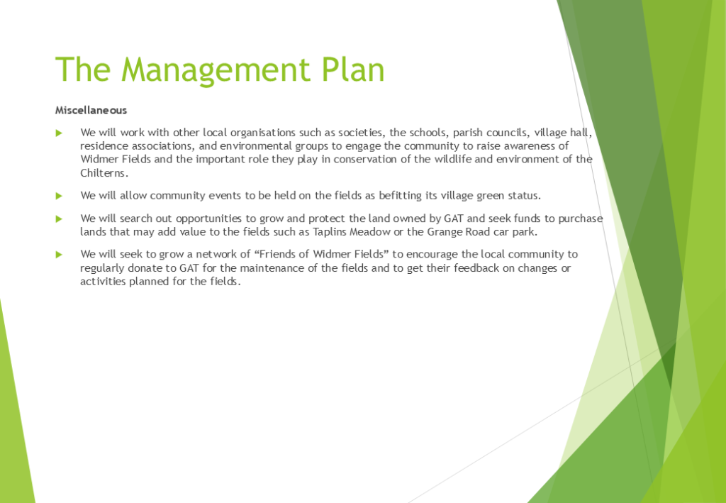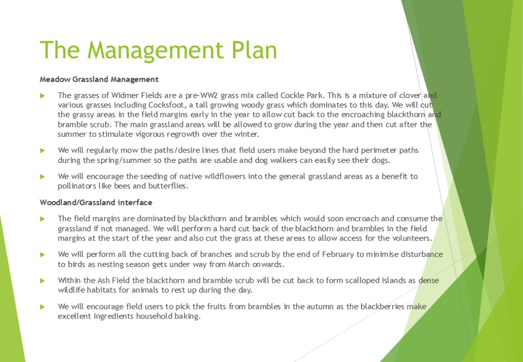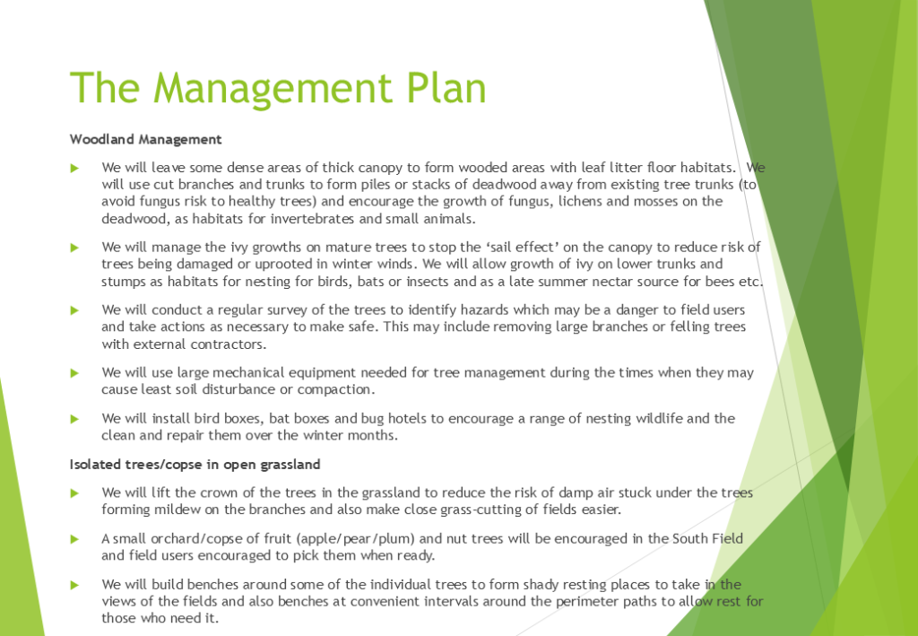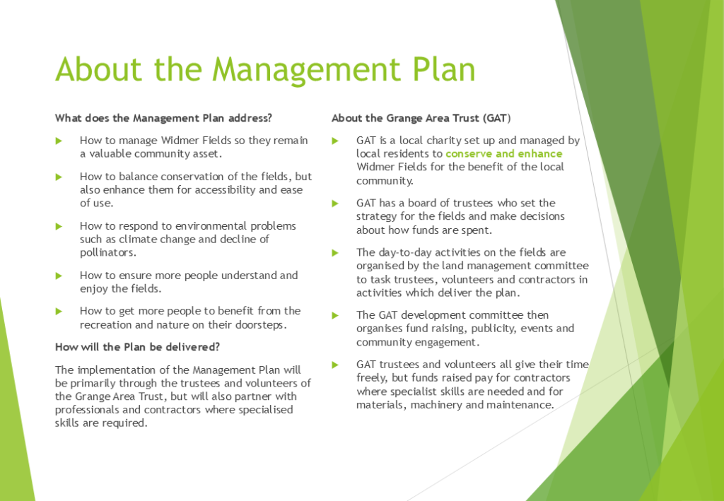 The Grange Area Trust (GAT) trustees and volunteers manage the fields to conserve and enhance them for the benefit of the local community. The plan for managing the fields is set out in the document below.